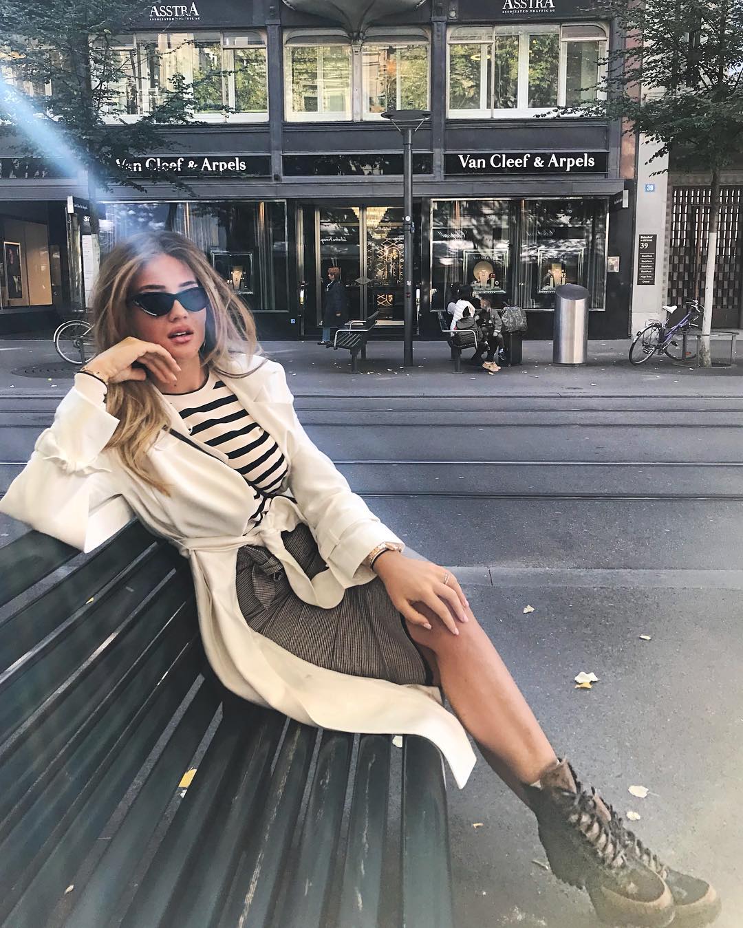 Bộ trang phục dạo phố đơn giản với áo phông kẻ cắm thùng cùng chân váy bút chì bỗng trở nên thời thượng khi Izabel khoác thêm 1 chiếc cardigan trắng dáng dài phía bên ngoài và nhấn nhá cùng kính mát mắt mèo, giày hầm hố.