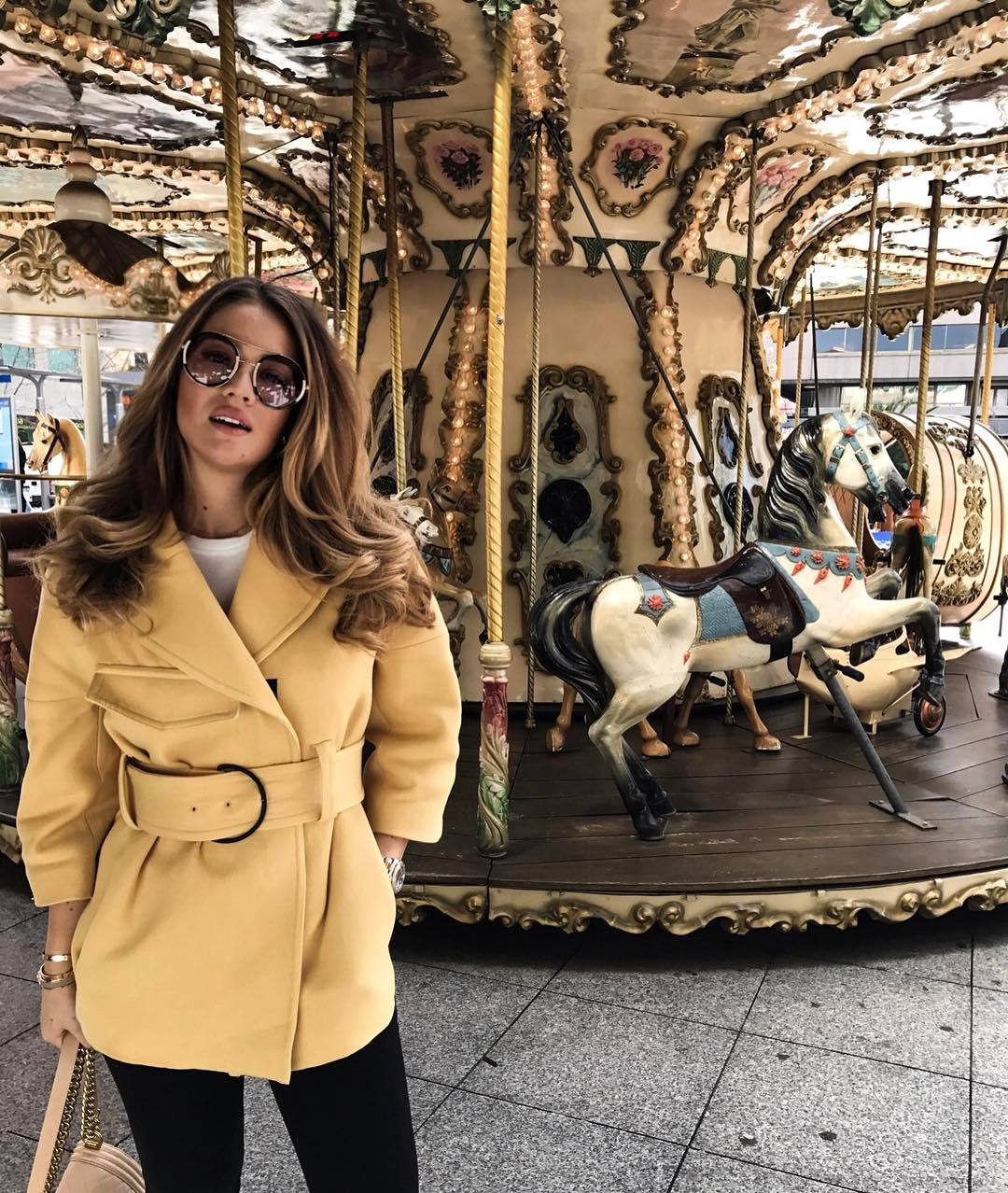 Chiếc áo khoác màu vàng hot trend càng tăng thêm phần sang chảnh khi được Izabel phối cùng các phụ kiện đi kèm với sắc be của chiếc Chanel boy và kính mát màu tràm.