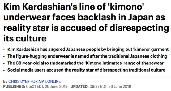 Sau khi dòng sản phẩm nội y định hình Kimono Solution Wear của Kim Kardashian đã gây tranh dữ dội trong cộng đồng người dân Nhật Bản vì họ cho rằng đó là sự xúc phạm văn hóa nặng nề, nhưng bên phía nàng Kim vòng ba vẫn khăng khăng không đổi tên và còn đăng ký độc quyền tên thương hiệu Kimono.