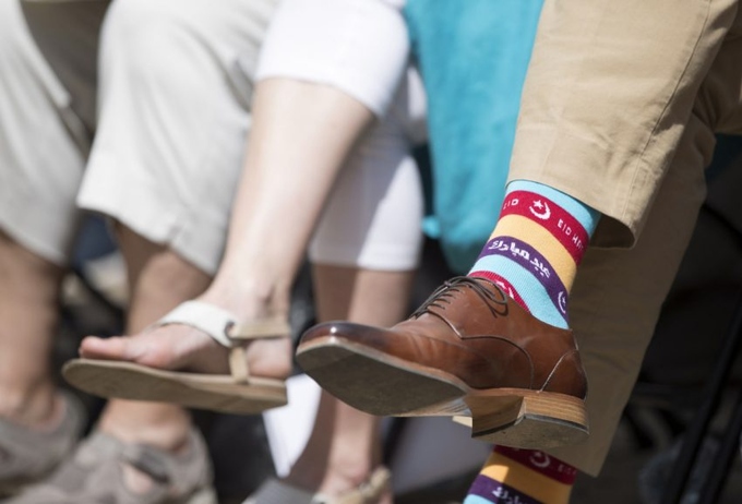 Thủ tướng Canada mang tất cầu vồng sọc ngang in dòng chữ “Eid Mubarak” trong ngày lễ Eid al-Fitr của người Hồi giáo. “Eid Mubarak” là lời chào của người Hồi giáo dành cho nhau trong lễ hội kéo dài ba ngày đánh dấu việc chấm dứt tháng ăn chay Ramadan. Chiếc vớ từ nhãn hiệu Toronto lấy cảm hứng từ Hallal, được bán với giá 14,99 đô la.