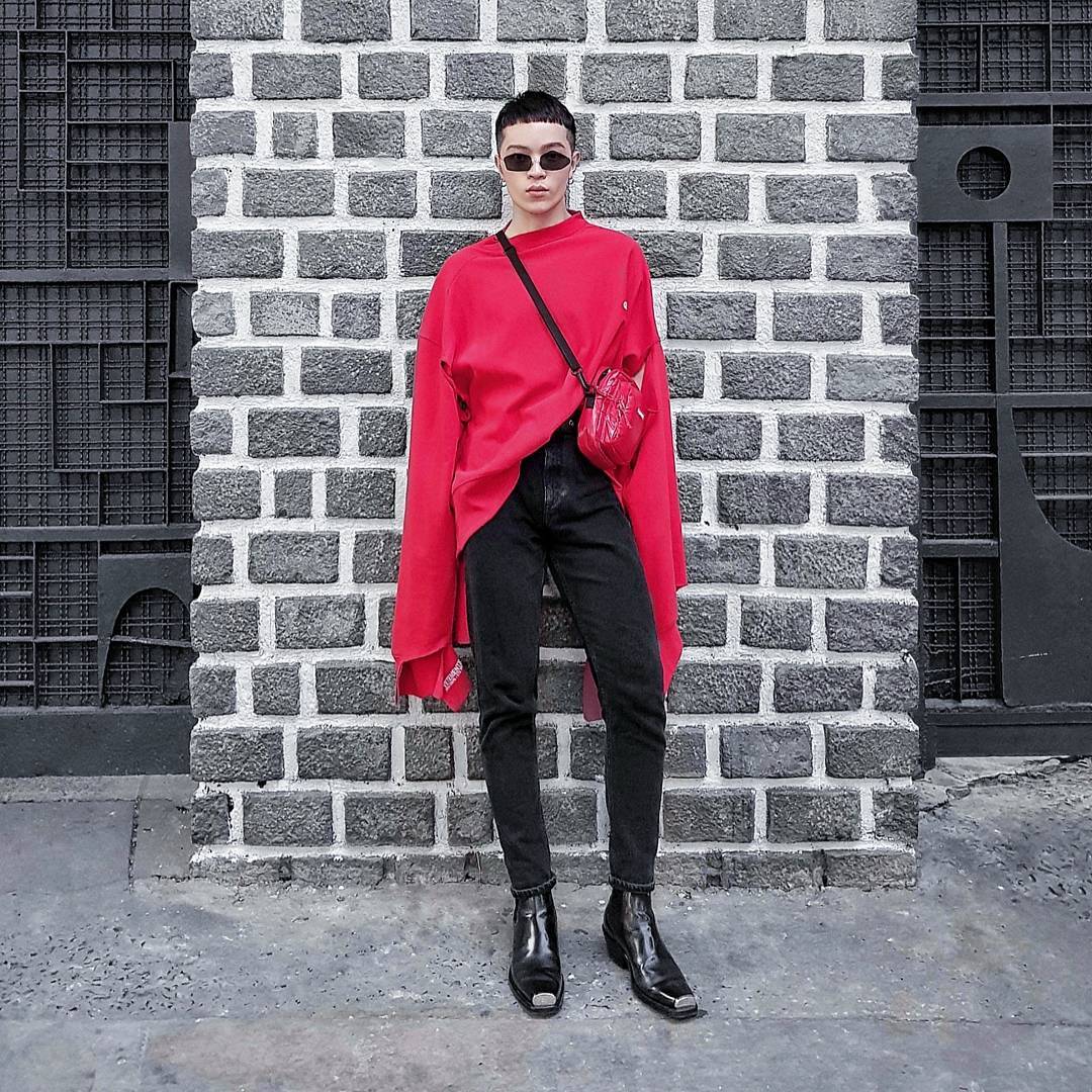 Stylist Kelbin lại là một hình tượng cá tính tuyệt đối. Lựa chọn áo thun tay dài được đóng thùng cách bất đối xứng, anh chàng chứng tỏ khả năng mix đồ cao tay khi phối chiếc áo phom rộng cùng với quần skinny jeans và boots khiến vóc dáng có phần bé nhỏ cuả anh không hề bị “nuốt chửng” trong trang phục. Bên cạnh đó, chiếc túi đeo chéo cùng màu áo đã “hoàn thành sứ mệnh” trở thành điểm nhấn đắt giá trong set đồ.