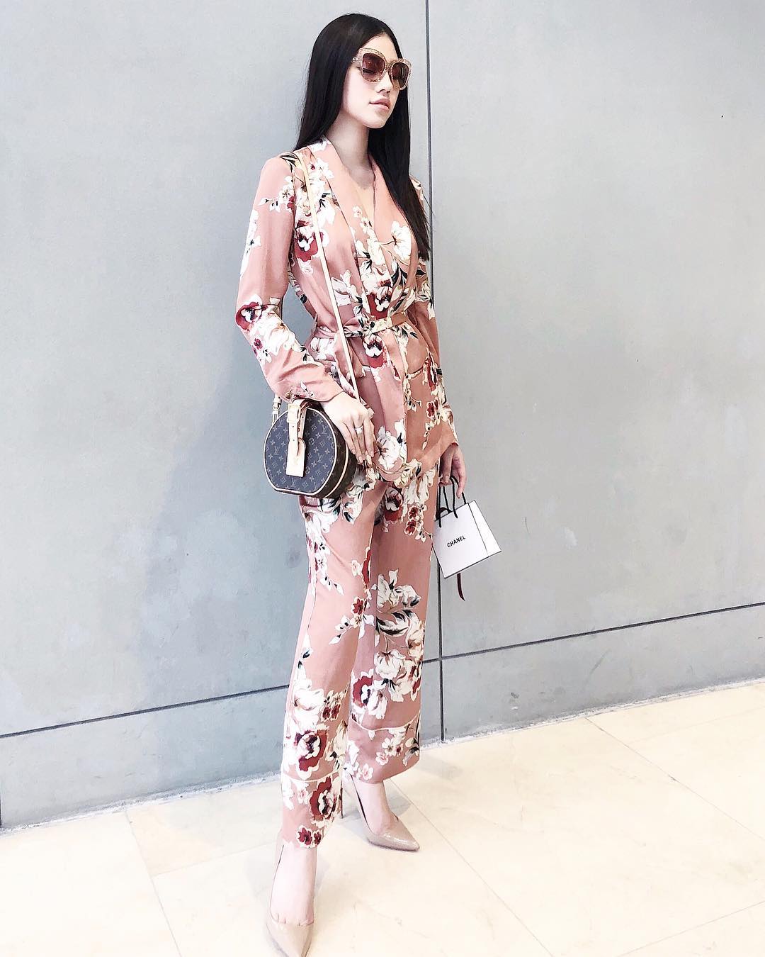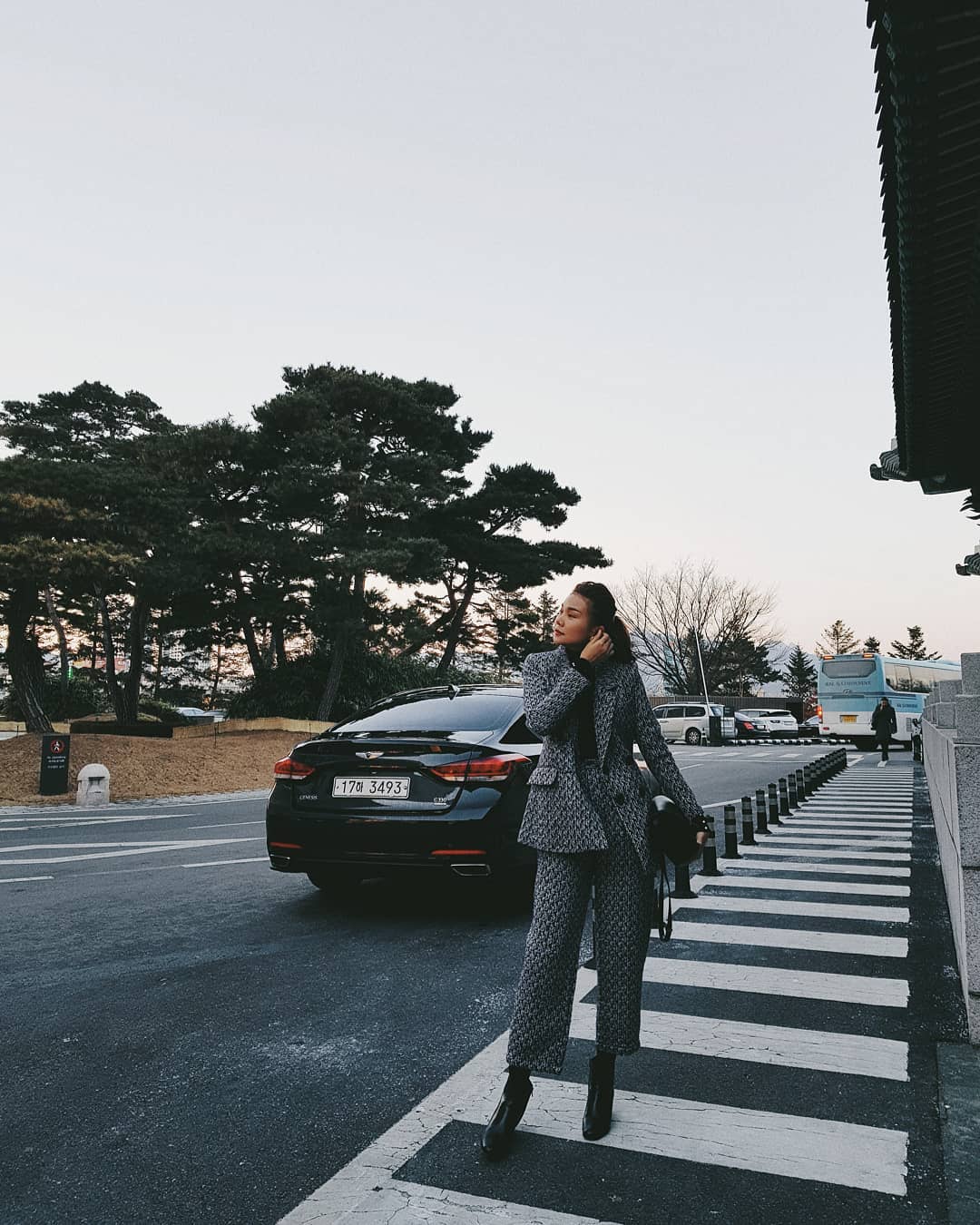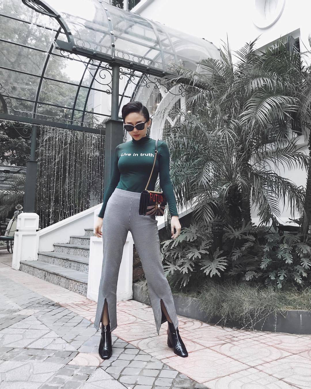 Thanh Hẳng cũng lựa chọn cách phối cùng tông với áo khoác và quần đồng chất liệu. Kết hợp với túi xách dạng hộp và boots da , nàng siêu mẫu đem đến hình tượng cá tính, thời thượng.