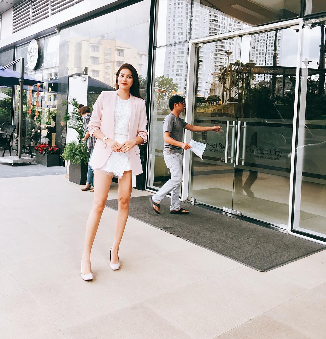 Phạm Hương vô cùng trẻ trung khi xuống phố với áo vest tông hồng phối cùng áo và chân váy ren trắng. Cả set đồ tông màu sáng khiến Hoa hậu Hoàn vũ 2015 trở nên thanh tao, thu hút hơn.