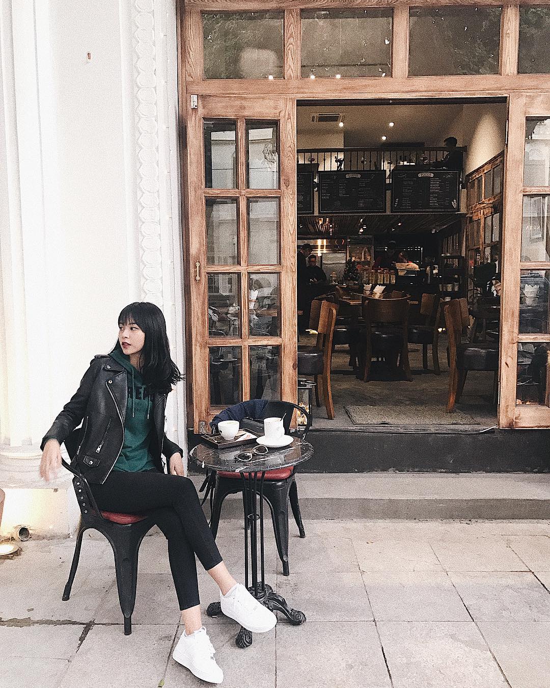 Cả cây trang phục màu đen không hề làm Phí Phương Anh kém nổi bật. Ngược lại, với cách phối những items khác chất liệu như áo khoác da bóng, quần kaki ôm… Quán quân The Face mùa 1 mang đến hình tượng trẻ trung, “tỏa sáng” đúng nghĩa khi xuống phố.