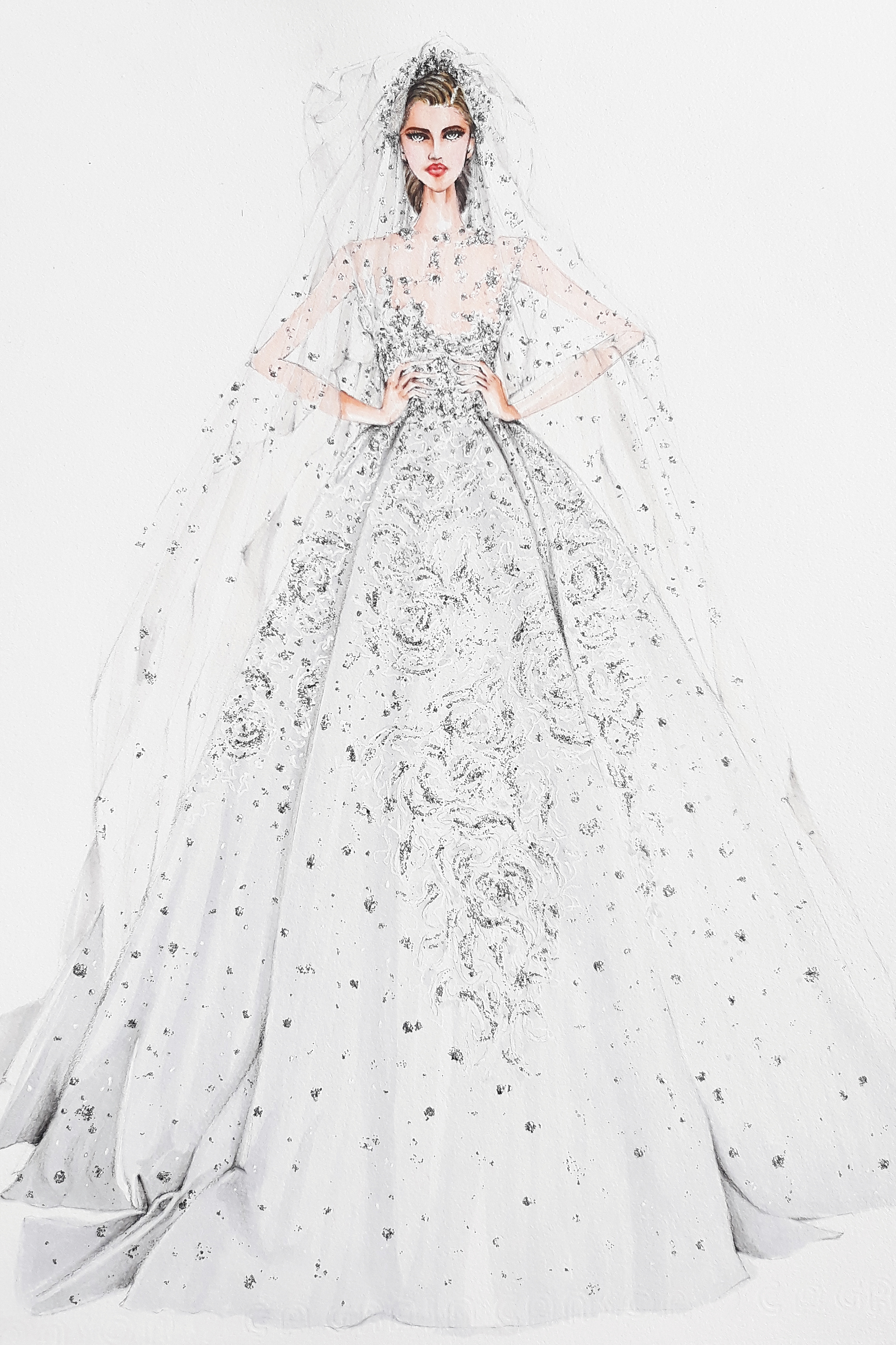 Mẫu váy đình đám của nhà mốt Elie Sabb qua nét vẽ minh họa của nhà diễn họa Lâm Á Luân. Đây cũng là mẫu váy gây “sốt” giới mộ điệu, nhanh chóng trở thành giấc mơ của mọi cô gái. Vậy còn gì hợp hơn? một “chiếc váy thế kỉ” cho một “đám cưới thế kỉ”.