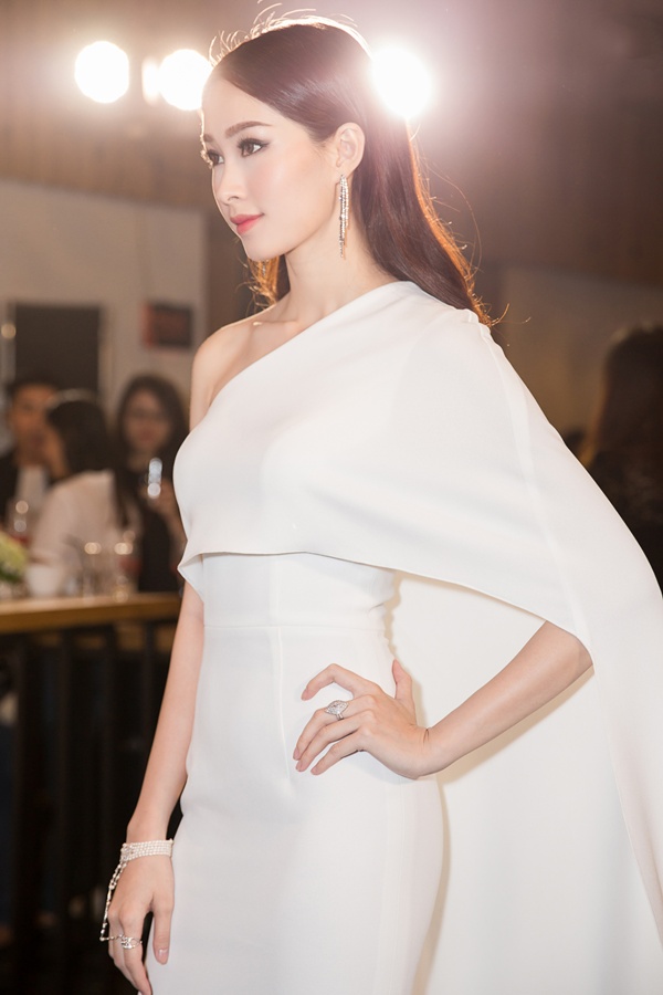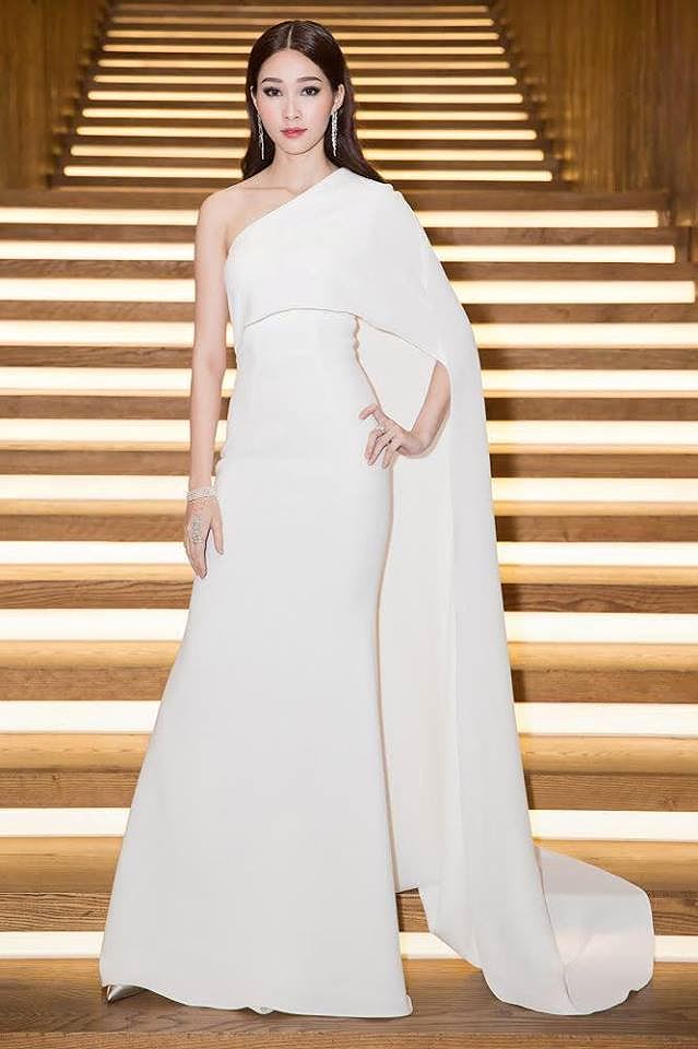 Trong khi đó Hoa hậu Việt Nam 2012 lại hoàn toàn chinh phục được khán giả bởi thần sắc và vóc dáng hoàn hảo. “Thần tiên tỷ tỷ” diện váy dạ hội cách điệu màu trắng muốt đẹp tựa “nữ thần” khi tham dự một sự kiện khai trương tại TP. HCM tối 10/7.