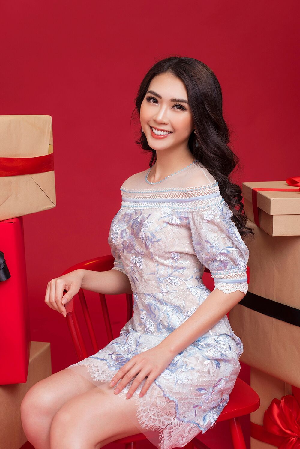 Một chiếc váy cổ yếm màu đỏ với những đường ren trang nhã kết hợp cùng đôi hoa tai ngọc trai đang là xu hướng đã giúp cho Tường Linh rạng rỡ hơn bao giờ hết.
