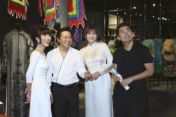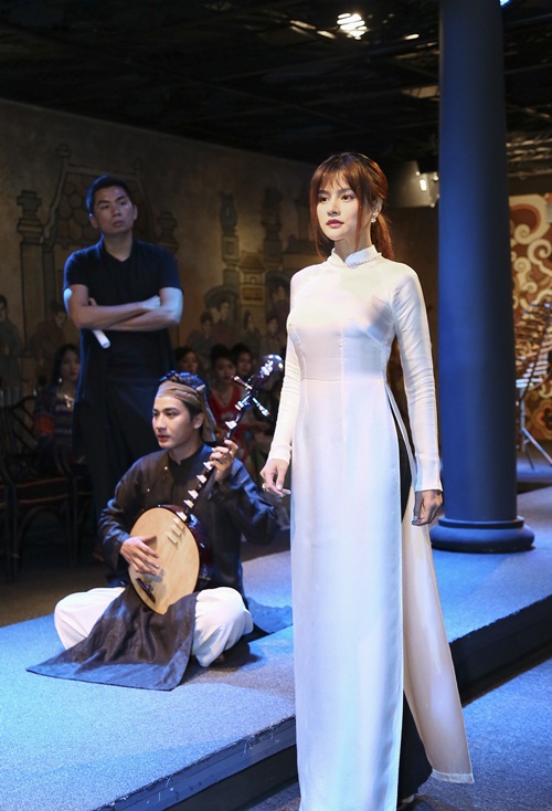 Sau khi tập luyện, cô cùng nhà thiết kế Adrian Anh Tuấn trao đổi ý tưởng cho ra mắt bộ sưu tập áo dài mới của anh.