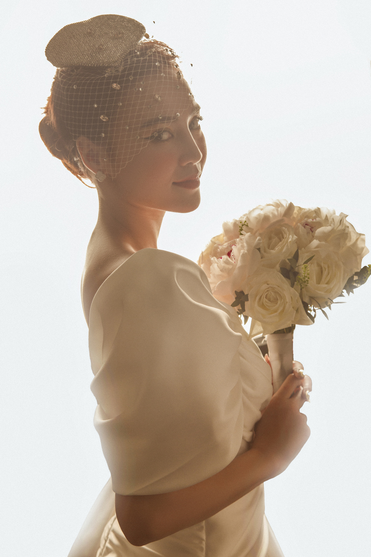 Ninh Dương Lan Ngọc mang đến hình ảnh cô dâu gợi cảm, hiện đại với chiếc váy ngắn cúp ngực trẻ trung. Thiết kế không hoạ tiết được tạo điểm nhấn bởi những đường gấp nếp tạo phom tinh tế. Cấu trúc bất đối xứng với chi tiết trải dài ở một bên thân váy mang đến nét duyên dáng cho người mặc.