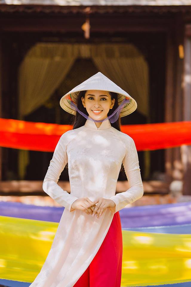 Hoa hậu Việt Nam 2018 gây ấn tượng với gương mặt hiền dịu, vóc dáng cân đối trong tà áo dài trắng tinh khôi.