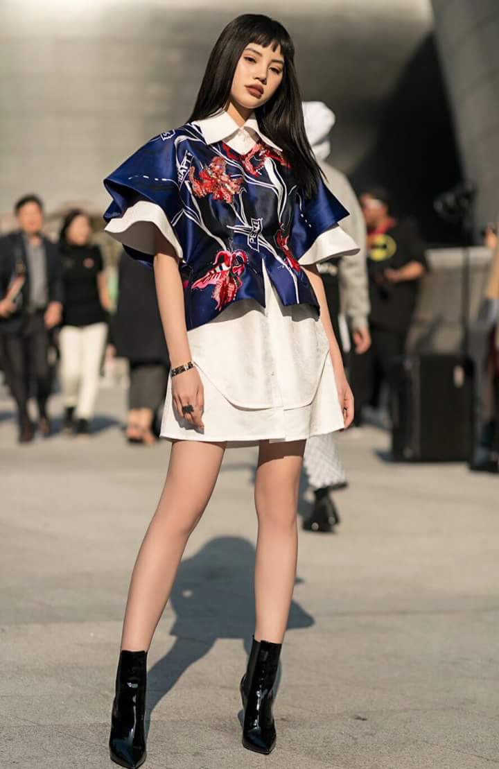 Không kém cạnh Phí Phương Anh, Jolie Nguyễn “tấn công” SeouL Fashion Week với bộ trang phục bao gồm váy trắng kết cấu 3D cùng với áo phồng in chuyển nhiệt kĩ thuật số họa tiết hoa lá. Chất liệu đan xen giữa độ nhẹ nhàng, mộc mạc của linen cùng độ bóng bẩy của taffta tạo nên cái nhìn thú vị cho cả outfit. Đi cùng boots và đặc biệt là kiểu tóc mái ngang cao cá tính, nàng hoa hậu thu hút mọi ánh nhìn từ người xung quanh.