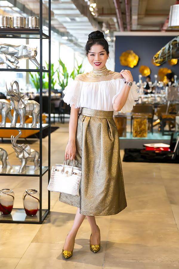 Tham dự một sự kiện thời trang với sự xuất hiện của vô vàn các mỹ nhân khác, Hà Kiều Anh hẳn có lý do khi muốn mình phải tỏa sáng. Tuy nhiên, chọn cả bộ váy gắn đèn led và có phần chi tiết vai quá cứng này làm vóc dáng hoa hậu bị mất điểm trầm trọng. Bộ cánh không xấu, nhưng không hợp với lứa tuổi và cũng làm cho số đo ba vòng Hà Kiều Anh hóa “phẳng lì”.