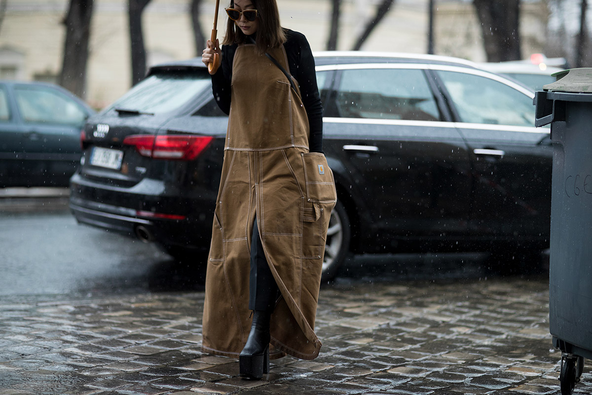 Tại Paris, dường như không có giới hạn nào cho việc ăn mặc. Miễn là bạn cảm thấy đẹp và tự tin với trang phục của mình. Ví như một chiếc yếm dài màu nâu tưởng chừng xuề xoà như thế này lại vẫn trông cực trendy, chẳng qua là phong thái bạn thể hiện trông ra sao thôi!