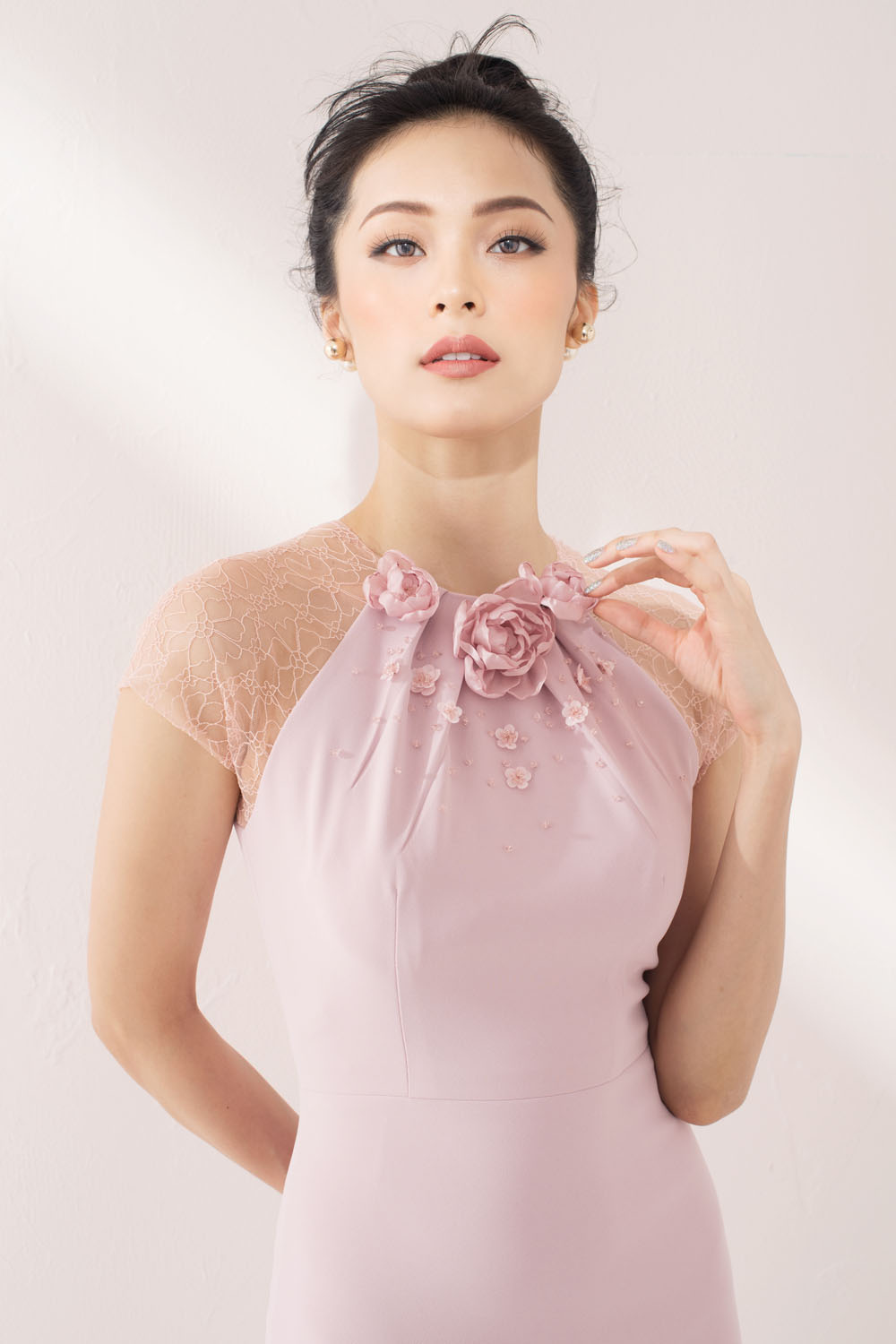 Kiểu tóc búi cao thanh tú giúp Hạ Vi khoe gương mặt tươi trẻ. Cô cũng trang điểm nhẹ nhàng, lãng mạn để phù hợp với phong cách trang phục.