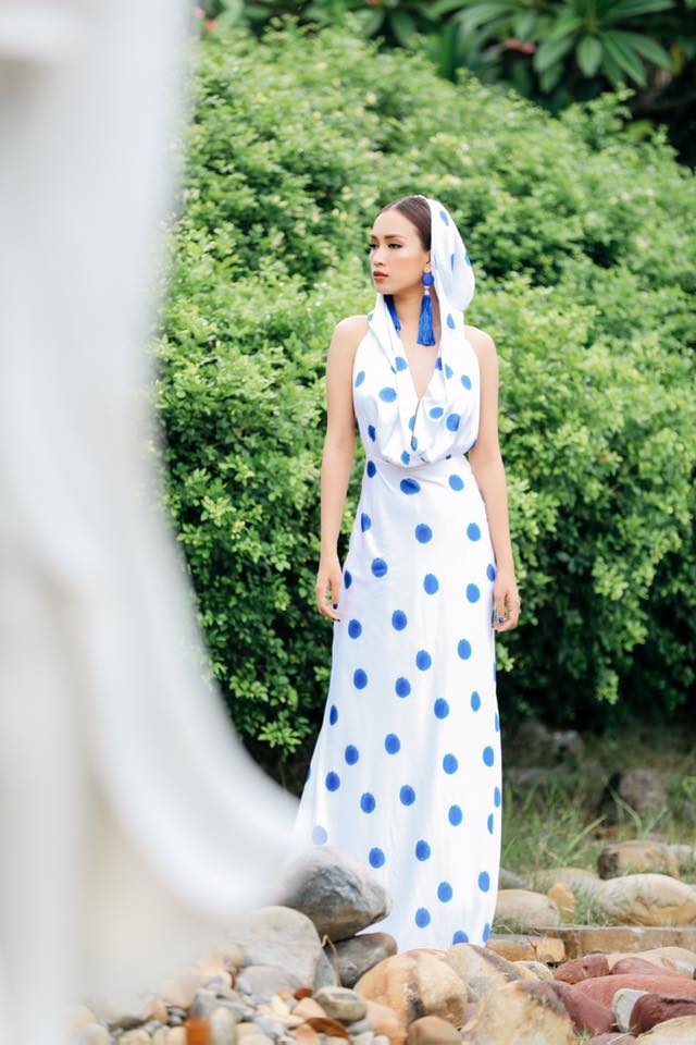 Họa tiết chấm bi khá nổi bật nhưng lại có phần không phù hợp với kiểu váy trễ ngực, đội đầu này. Thêm vào đó, đôi hoa tai tua rua dù đẹp cũng hoàn toàn không ăn nhập tổng thể.