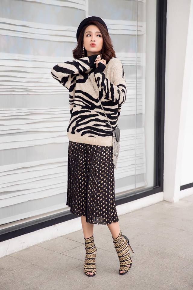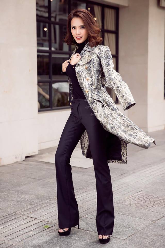 Nhiều lần, cô nàng từng chưng diện những bộ cánh street style khá ổn. Đơn cử như cả cây áo cổ lọ cùng quần ống suông, phối layer với áo khoác dáng dài họa tiết da động vật này.