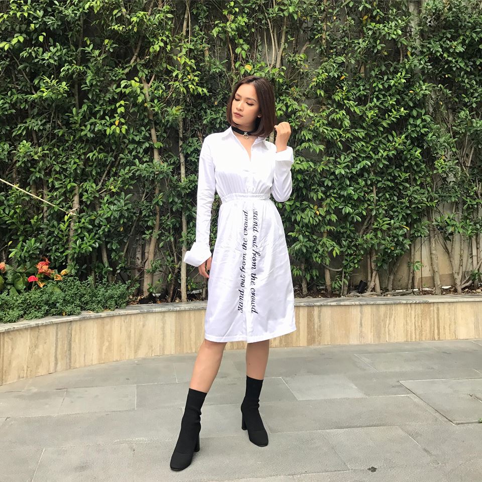 Hay xuống phố cùng chiếc váy trắng thêu dòng chữ khá nhẹ nhàng nhưng vẫn đủ nổi bật. Giọng ca “Tôi thấy hoa vàng trên cỏ xanh” lựa chọn phối cùng sock boots đen thời thượng.