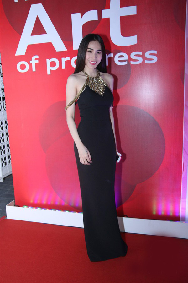 Phần cánh tay gầy guộc lộ rõ trong mẫu đầm hai dây, cúp ngực lấp lánh.