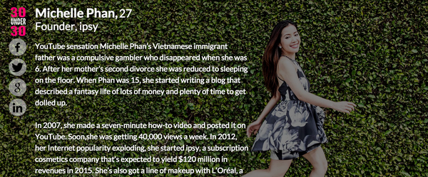 Cho tới khoảng đầu năm 2016, cả tạp chí Nylon và Forbes đều tôn vinh cô gái gốc Việt này trên trang bìa.