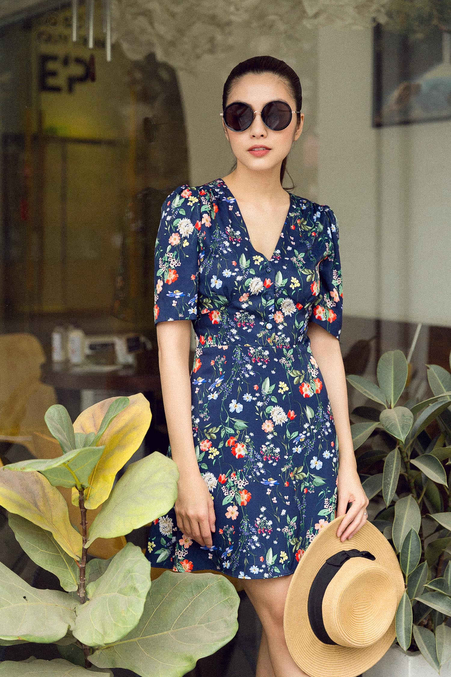 Chiếc đầm màu vàng họa tiết hoa nhí đem đến cho Hà Tăng nét thanh tao, dịu dàng.