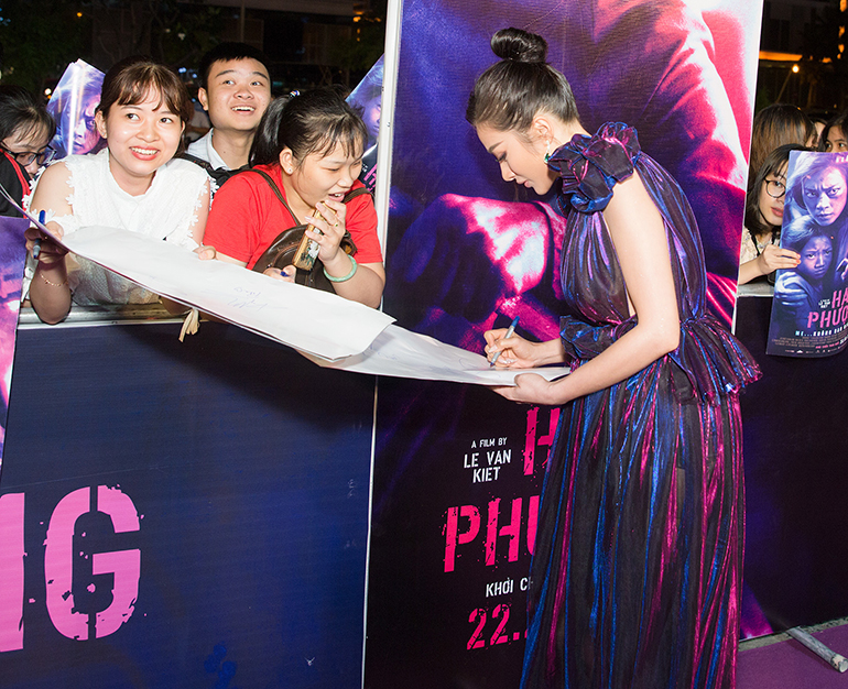 Chiếc váy Yaya Trương Nhi diện trong buổi công chiếu được thiết kế riêng với màu chủ đạo của poster film dành riêng cho film Hai Phượng.