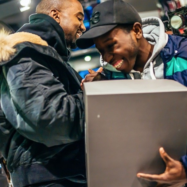 Không chỉ xuất hiện tại buổi ra mắt Yeezy Boost 750, Kanye còn tận tay đưa giày cho những người may mắn.