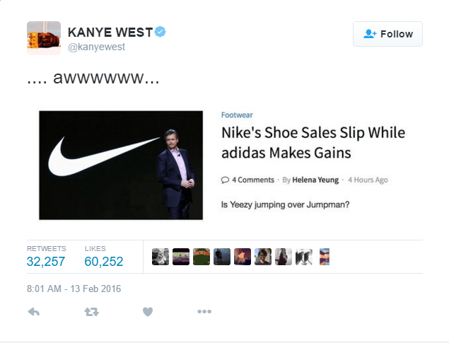 Dù lâu nay vẫn chễm chệ đỉnh cao nhưng Kanye West không quên để ý tình hình “tình cũ”. Dòng châm chọc mà Kanye gửi đến Mark Parker cùng những đồng nghiệp xưa là đường link bài viết “Doanh thu Nike tuột dốc, adidas đang đà đi lên” kèm caption “…. awwwwww… ” trên Twitter năm ngoái.