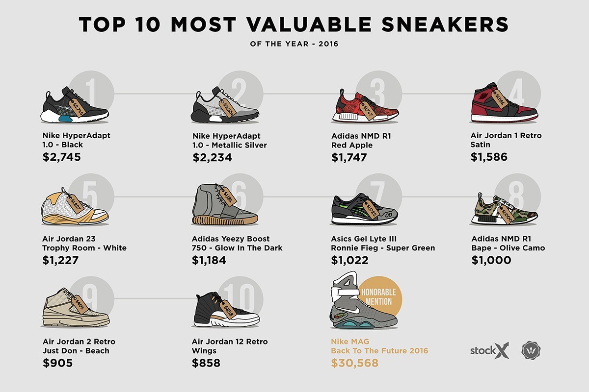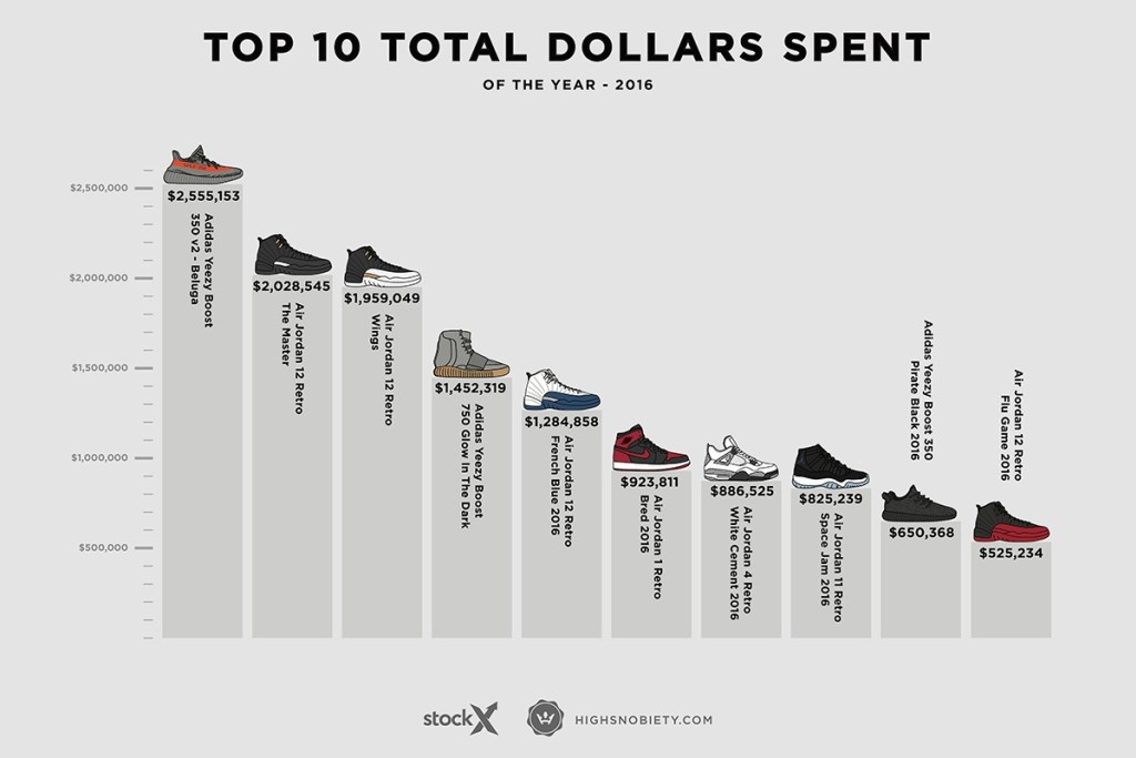 Theo báo cáo của StockX (website chuyên thống kê giá giày trên thị trường bán lại dựa vào chợ điện tử eBay, Amazon…) về 10 mẫu giày sở hữu trị giá ngất ngưỡng so với con số niêm yết trong 2016 thì Yeezy và Jordan là 2 cái tên thống trị bảng xếp hạng. Trong đó, Yeezy Boost 350 V2 phối màu Beluga là phiên bản thu lợi vượt mốc 2 triệu đô, chỉ tính ở eBay.