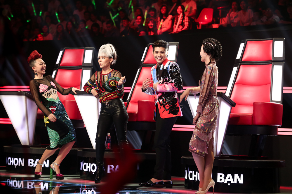 Bộ tứ HLV The Voice 2017 Tóc Tiên, Thu Minh, Noo Phước Thịnh và Đông Nhi trẻ trung, hiện đại trên ghế nóng.