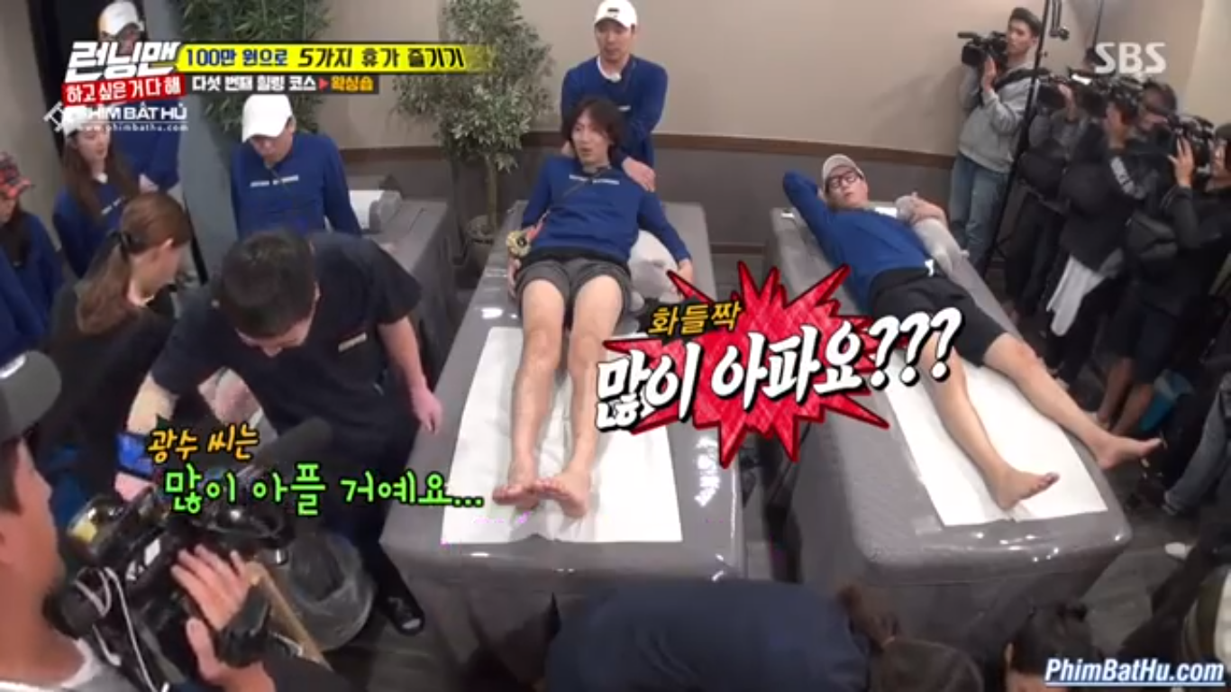 Với sự đoàn kết và bá đạo của mình, 6 thành viên còn lại đã bỏ phiếu cho Kwang Soo, Suk Jin và Se Chan cùng nhau trải nghiệm thú vị trị giá 1 triệu Won này. Với việc sở hữu một đôi chân rậm rạp Kwang Soo, đã phải khóc thét với những tiếng la vang trời, còn anh chàng mũi to Suk Jin và Se Chan chỉ biết câm nín ôm gấu bông chịu đựng.