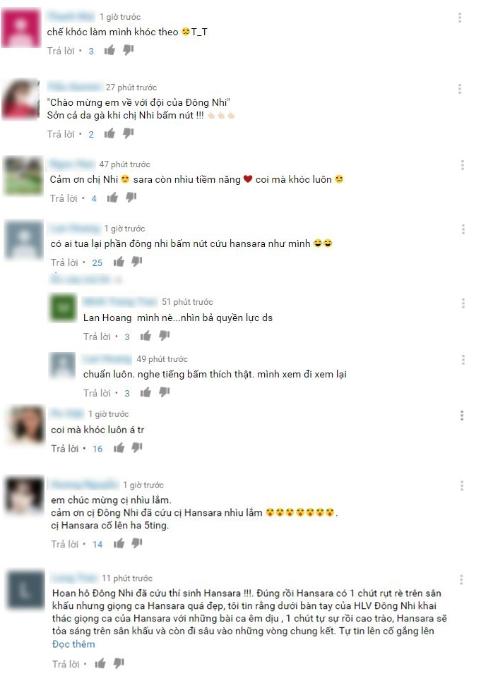 Ngoài ra, trên Youtube cùng các trang mạng xã hội, nhiều khán giả đã không ngừng bày tỏ sự xúc động trước hành động của HLV Đông Nhi. Kèm theo đó là những chia sẻ và ủng hộ cho Han Sara bước tiếp tại chương trình.