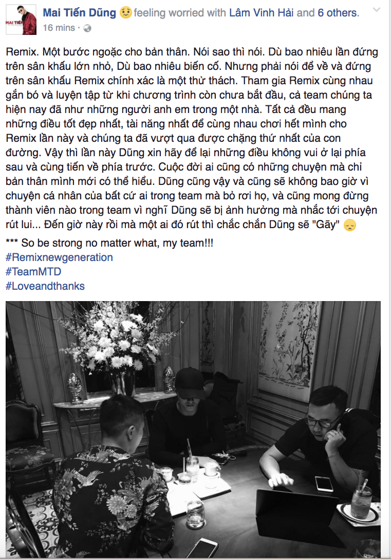 Trước những áp lực này, Mai Tiến Dũng vừa có những chia sẻ mới nhất để động viên các thành viên trong team mình. Dù không đề cập đến, tuy nhiên, trong “lời tự sự” của mình - dù được viết với lời lẽ vô cùng tế nhị và tình cảm, nhưng khán giả không khó để nhận ra Mai Tiến Dũng đang nhắc đến những những ồn ào chuyện tình cảm của Lâm Vinh Hải khiến cả team vướng phải không ít khó khăn, đặc biệt là việc chàng biên đạo đã từng có ý định rút lui khỏi chương trình lần này.