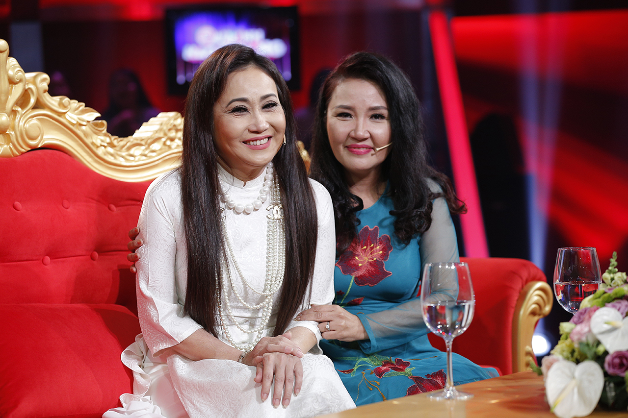 Nghệ sĩ Thanh Hằng (áo trắng) bên cạnh em gái Ngân Quỳnh.