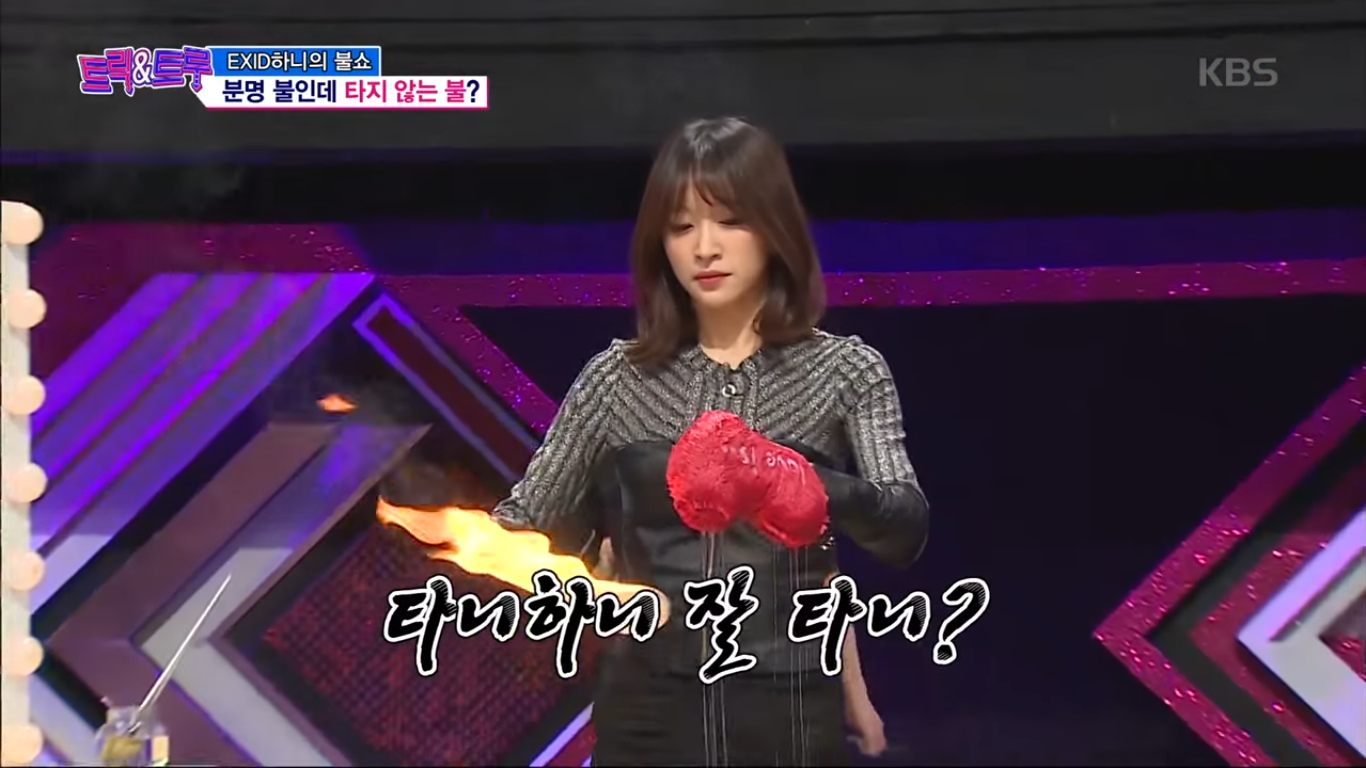 Chắc hẳn các fan Kpop đã quá quen thuộc với độ lầy và nhây xuyên lục địa của “Nữ thần fancam” Hani. Và chính nhờ vào sự hài hước này mà Hani đã nhanh chóng trở thành “Nữ thần giải trí mới” của các show giải trí tại Hàn Quốc. Mới đây nhất là trong show truyền hình Trick & True, Hani đã khiến khán giả một phen hoảng hốt khi trình diễn ảo thuật với lửa.