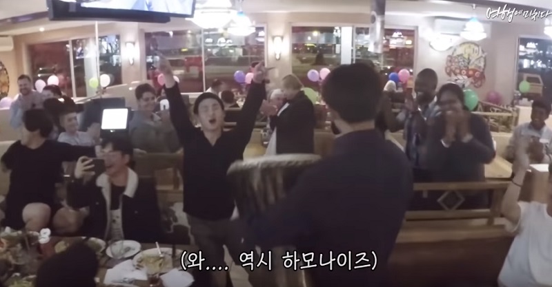 Các thực khách Hàn Quốc tỏ ra vô cùng ngẫu hứng khi nhân viên tại một nhà hàng ở Nam Phi mang cho họ một chiếc trống Djembe (châu Phi). Khi một nam thực khách gõ trống, cả nhóm đồng thanh hát vang ca khúc “The Circle of Life” trong bộ phim hoạt hình nổi tiếng “Vua sư tử”. Màn biểu diễn hay tới nỗi một số nhân viên nhà hàng cũng nhún nhảy và hát theo. Ảnh: NS