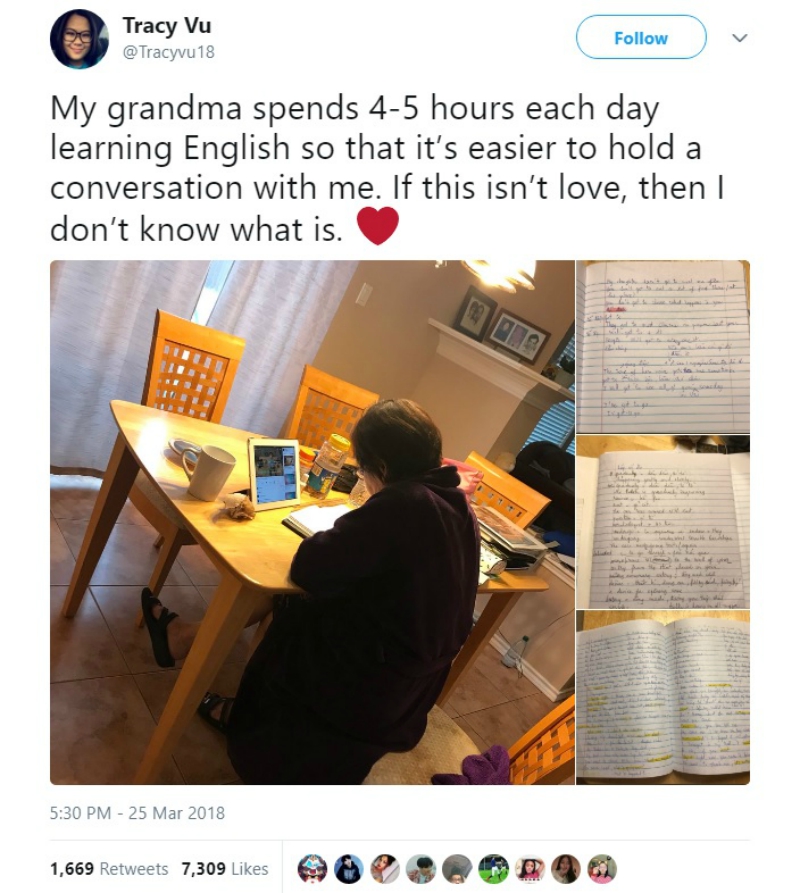 Dòng trạng thái được bạn trẻ gốc Việt Tracy Vu chia sẻ trên trang Twitter cá nhân vô tình thu hút sự chú ý của cộng đồng mạng. Theo đó, để trò chuyện được với cháu gái ở nước ngoài, bà ngoại của Tracy Vu quyết tâm học tiếng Anh mỗi ngày. “Bà tôi dành từ 4-5 tiếng mỗi ngày học tiếng Anh chỉ để giao tiếp được với tôi. Nếu đây không phải là tình yêu thì tôi không còn biết thế nào là yêu thương nữa”, Tracy Vu viết. Ảnh: Twitter