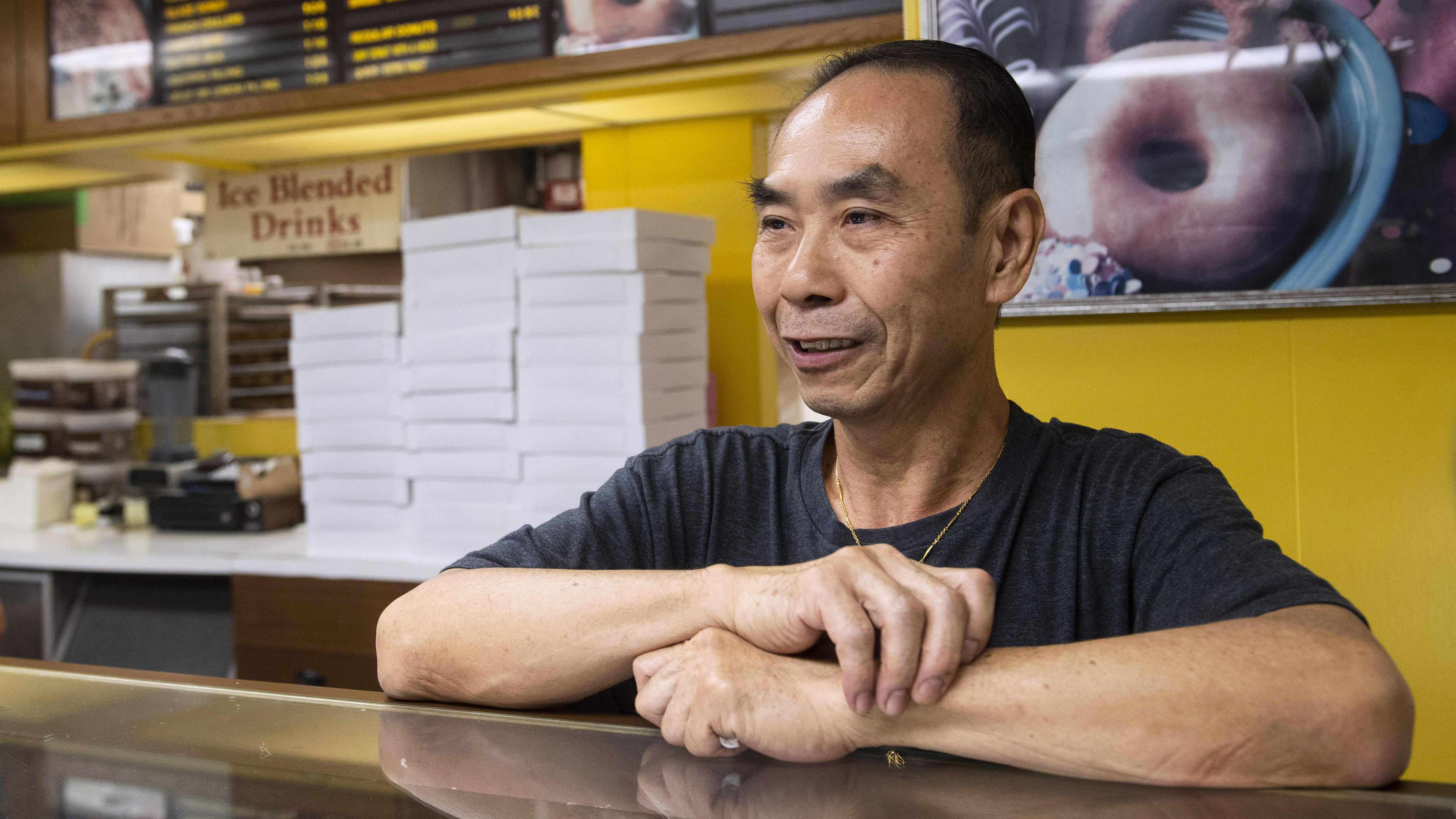 John và Stella Chhan, ông bà chủ cửa hàng bánh nướng Donut City ở thành phố Seal Beach, bang California , đều là người tị nạn Campuchia ở Mỹ. Họ mở nhà hàng bánh và điều hành nó trong suốt 30 năm. Sau khi biết bà Stella bị ốm và cần người chăm sóc, các khách hàng quen đã mua toàn bộ số bánh từ sáng sớm để ông John có thể về nhà chăm sóc người vợ đau ốm. Ảnh: SCNG
