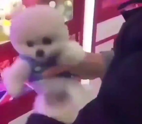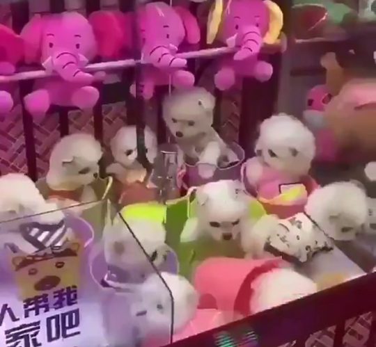 Video khoảng 10 chú chó nhỏ trong máy gắp thú nhồi bông ở Trung Quốc.