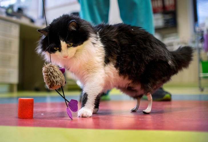 Chú mèo vô gia cư này đã bị một chiếc xe đâm vào và mất đi 2 chân. Một bác sĩ phẫu thuật người Bulgaria đã tiến hành ghép chân để giúp chú mèo có cơ hội đi lại.