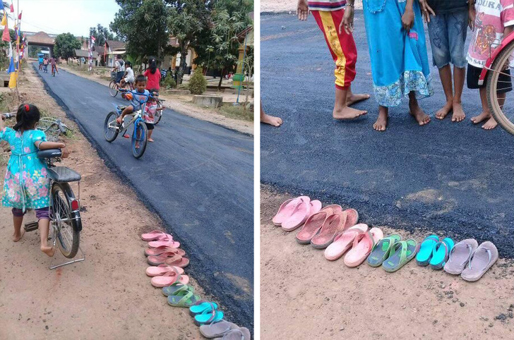 Đây là những tấm ảnh ghi lại đám trẻ con ở một ngôi làng Indonesia tự cởi giày đi chân đất vì sợ làm bẩn con đường mới được trải nhựa mà lần đầu tiên chúng thấy trong cuộc đời.