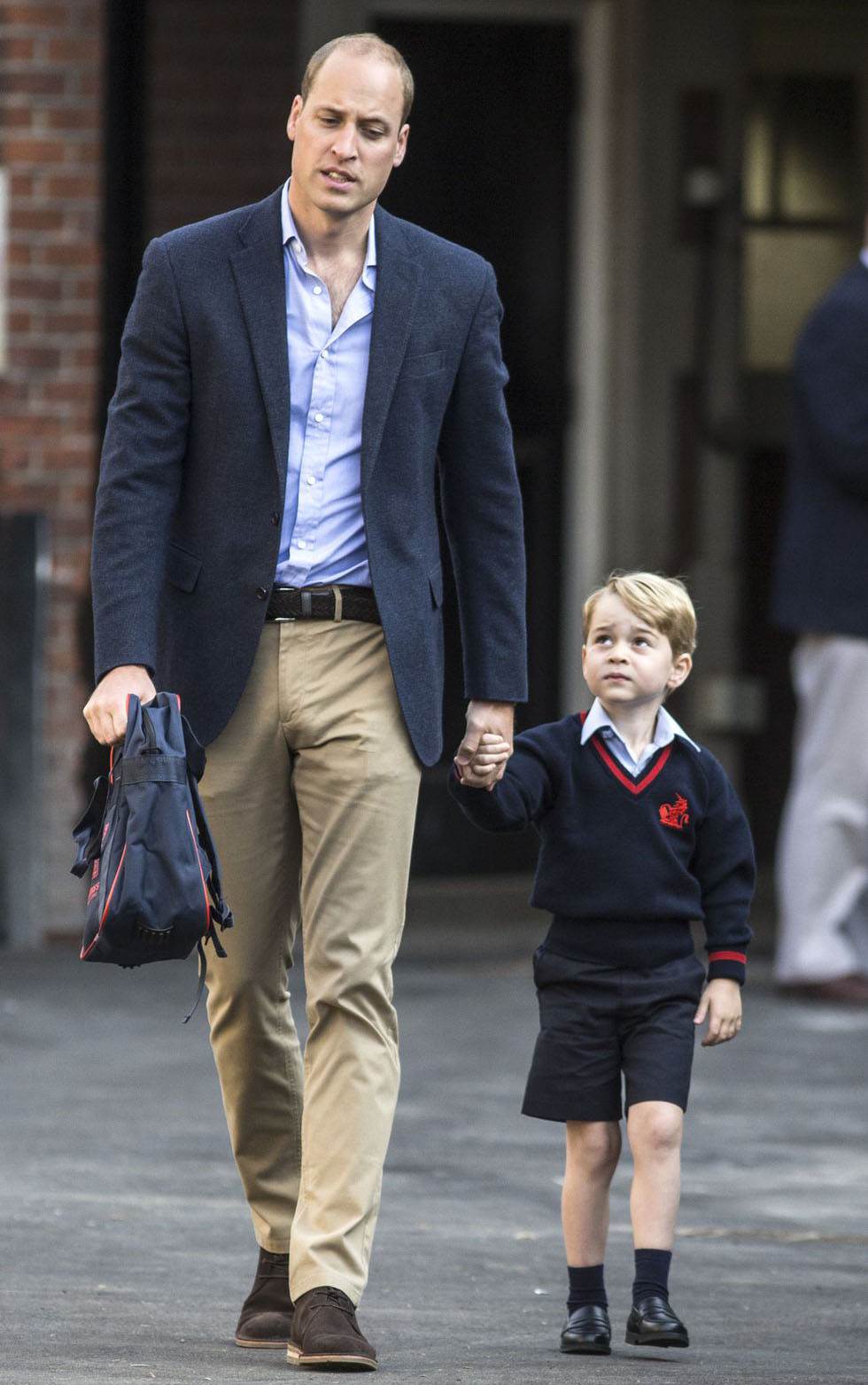 Ngày đầu tiên đến trường của Hoàng tử George. Vẻ lo lắng hiện rõ trên gương mặt cậu bé. Tuy nhiên, cái nắm tay của ông bố hoàng gia giúp cậu yên tâm hơn. Ảnh: Getty