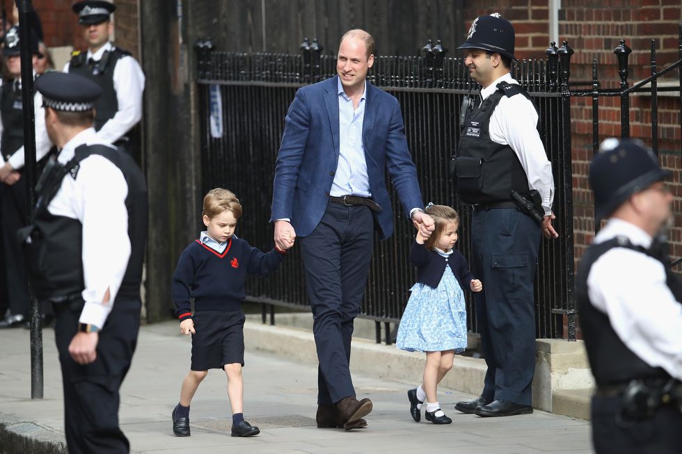 Công tước xứ Cambridge cùng con trai và con gái tới bệnh viện St. Mary để chào đón thành viên bé nhỏ mới của gia đình, Hoàng tử Louis - chào đời năm 2018. Ảnh: Getty