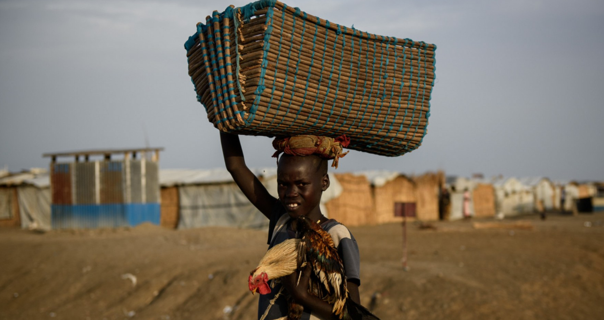 Cậu bé Latjor Mayal, 12 tuổi, đang đội một giỏ đồ trên đầu và ôm một con gà tới khu vực Bảo vệ người dân (PoC). Cậu bé đã phải đi bộ đoạn đường dài 100km từ Buaw trong vòng một ngày để tới được đây.