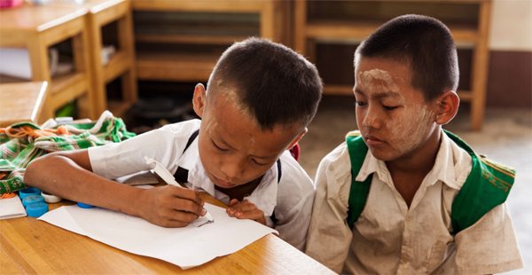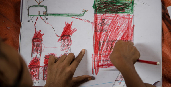 Min Thiya, 10 tuổi (bên trái), đang ngồi vẽ về một đồ vật làm bằng kim loại đã giết chết bạn của cậu bé là So Aung Myo Win. Khi đó, Myo Win cầm “vật thể lạ” đó giơ lên rồi ném đi. Nó không chỉ khiến Myo Win mất mạng mà còn làm 4 đứa trẻ khác bị thương.