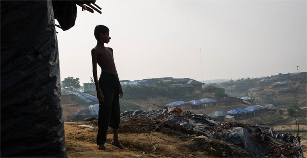 Mohammed Yasin, 8 tuổi, đang đứng trong khu trú ẩn của người Rohingya ở trại tị nạn tạm thời Kutupalong, quận Cox's Bazar, Bangladesh.