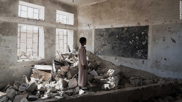 Một sinh viên đang đứng tại trường học cũ ở Saada, Yemen, nơi bị phá hủy nặng nề bởi cuộc ném bom ngày 24/4. Hệ thống giáo dục của Yemen đang đứng trên bờ vực sụp đổ, hơn 5 triệu trẻ em có nguy cơ bị tước đoạt quyền đi học. Tính đến tháng 7/2017, hơn 193.000 giáo viên không nhận được tiền lương trong 9 tháng liên tục và có 222 vụ đánh bom vào trường học đã được ghi nhận.