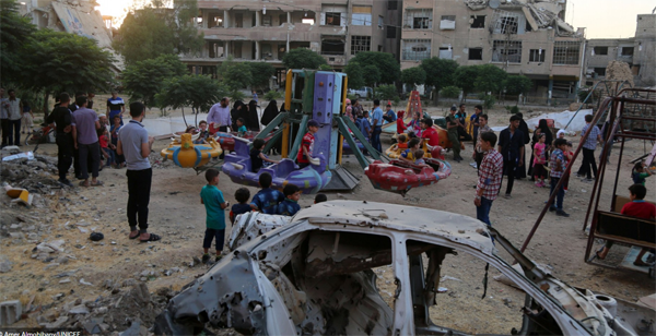 Trẻ em vui chơi tại công viên giải trí Eid ở Damascus, Syria trong ngày lễ Eid al-Fitr. Dù xung quanh là những tòa nhà bị phá hủy nặng nề, những chiếc xe hư hỏng thì lũ trẻ vẫn tổ chức lễ Eid al-Fitr, cố gắng sống bình thường như trước như khi chưa có xung đột xảy ra.