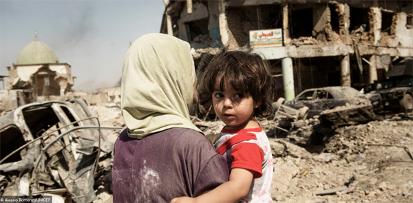 Một người phụ nữ bế con băng qua một tòa nhà đổ nát và những chiếc xe bị phá hủy để chạy trốn khỏi thành phố Mosul, Iraq. Chiến tranh không chỉ khiến trẻ em phải vật lộn với những cơn đau da thịt, mà còn khoét sâu vào tâm hồn non nớt của những đứa trẻ.