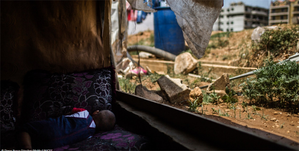 Một đứa trẻ 18 tháng tuổi đang nằm ngủ tại một khu tị nạn tạm thời dành cho người Syrians ở ngoại ô Zahle, Thung lũng Bekaa, miền đông Lebanon. Tính đến 6/2017, Lebanon có khoảng 1.5 triệu người tị nạn từ Syria.