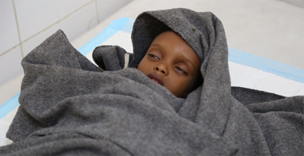 Một đứa trẻ mắc bệnh tả đang nằm điều trị tại Bệnh viện Alsadaqah, Yemen.